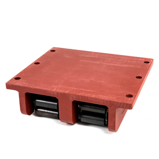 Further upgrading to the Super Robust construction provides superior strength and stability against torsion and fatigue over time under extreme loads and extreme rolling forces. Using load wheels manufactured from hardened 50CrV4 steel creates a higher safety capacity against point loading (rocking) and side forces (wind). The addition of a “channel”-type chain guide to the center plate keeps the load wheels in a track preventing wheels from scraping against the walls and prevents chain damage. These Machine Rollers are specifically made for permanent load carrying, where loads sit on these rollers for many years, must roll a long distance, and must be safe even when subjected to rocking or side forces. (Models KS and KZ.)