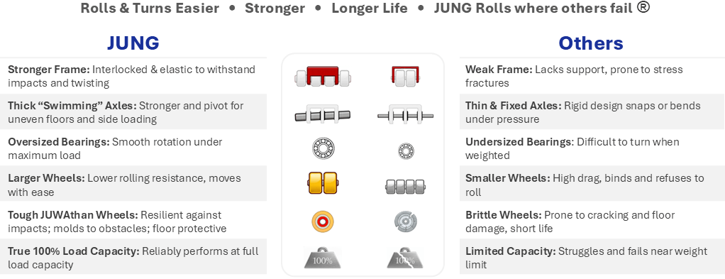 • Machine skates will roll & steer easily at max capacity, where others would fail to roll.