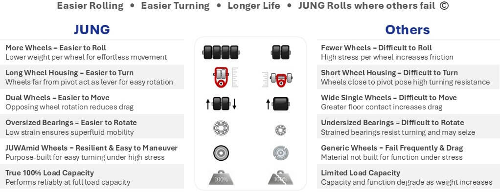 JUNG rotating dollies are Made in Germany and offer the highest reliability, ease of use and function employing superior technology, engineering, and manufacturing quality. Our machine moving dollies provide stable dependable support for load transport, roll & turn easily, and move loads safely even at the maximum rated capacity. These machinery dollies offer the following features: